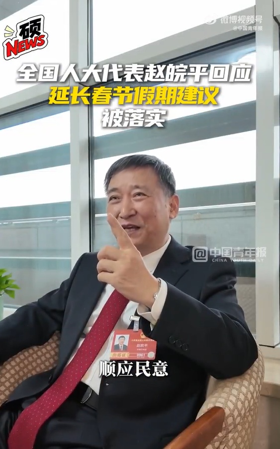 去年12月,十四届全国人大常委会第十九次会议邀请他作为列席代表参加。会上,国家发展和改革委员会主任郑栅洁作的报告中,特别提到“延长春节假期”建议的办理。他表示:“很多代表建议延长春节假期,我委认真分析研判,积极推动优化节假日安排,回应了社会期待,增强了人民群众的节日获得感与幸福感。”