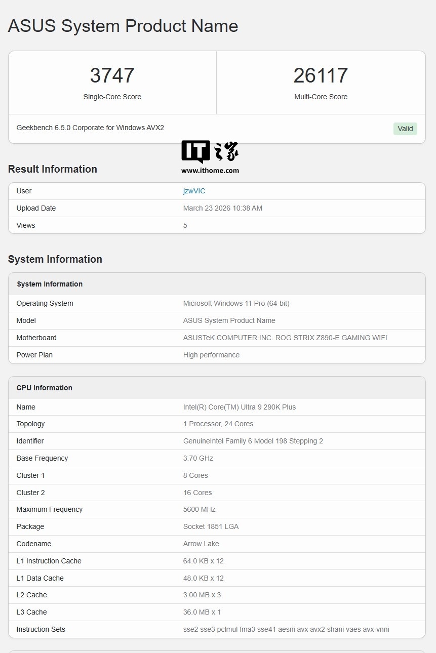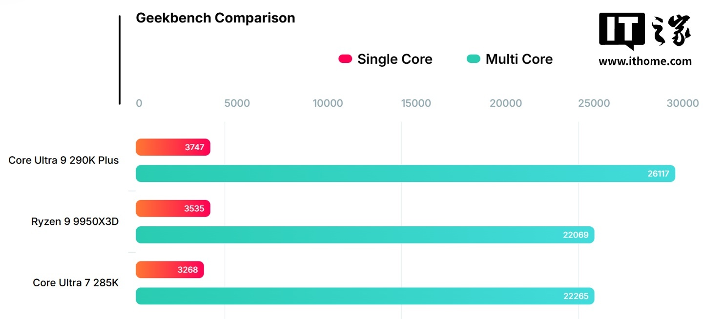 IT之家 3 月 24 日消息,科技媒体 Wccftech 昨日(3 月 23 日)发布博文,报道称英特尔未发布的旗舰处理器酷睿 Ultra 9 290K Plus 现身 Geekbench 跑分库,6.5.0 版本单核成绩为 3747 分,多核成绩为 26117 分。